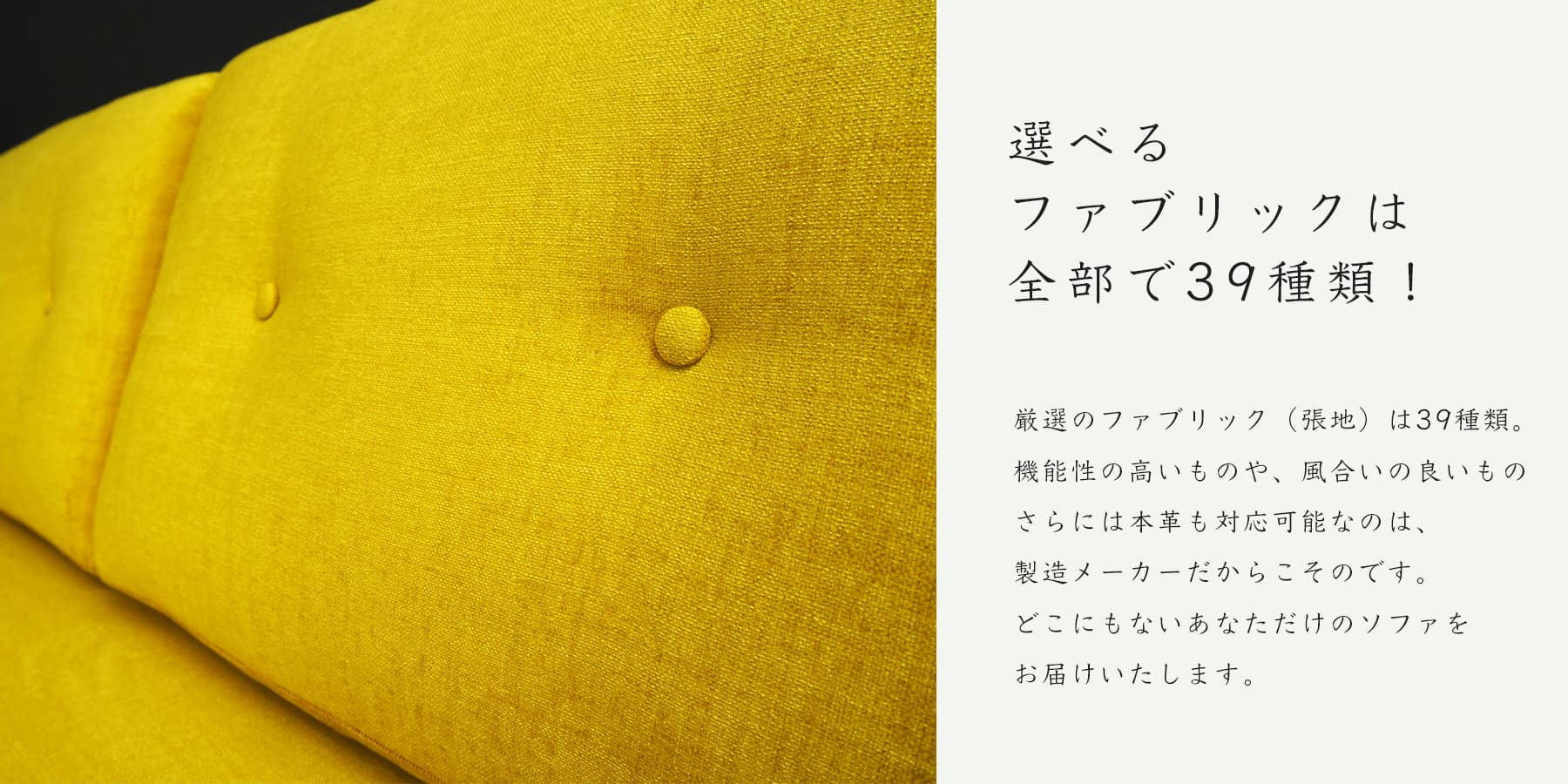 39種類の張地の中から本体、座面、背クッション、別々の張地をお選びいただけます。全てを自由に選べるのがオーダーメイドソファの素晴らしさです。きっとあなたのお部屋にマッチしたソファが完成します。