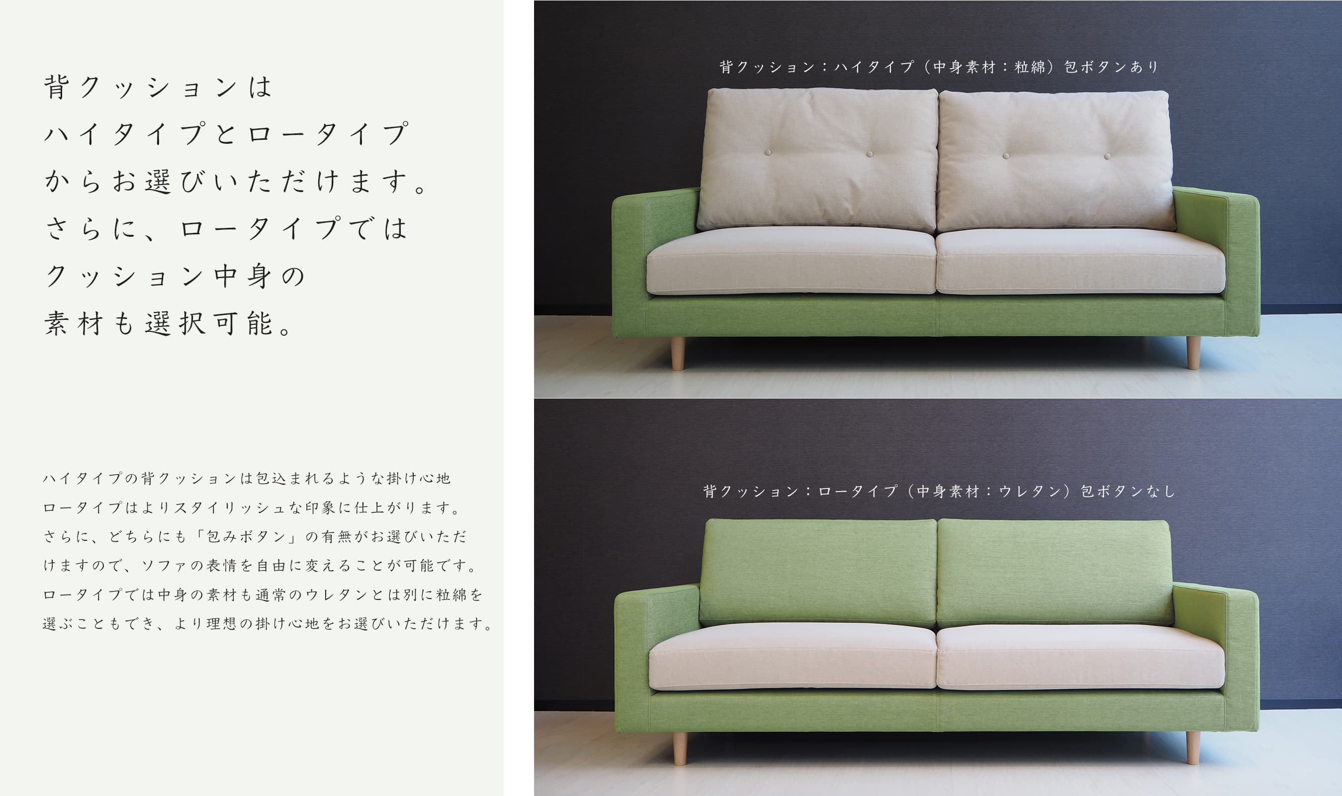ソファのタイプや張地が決定したら背クッションの高さや仕様をお選びください。オーダーソファならではの細やかな指定が可能となっております。