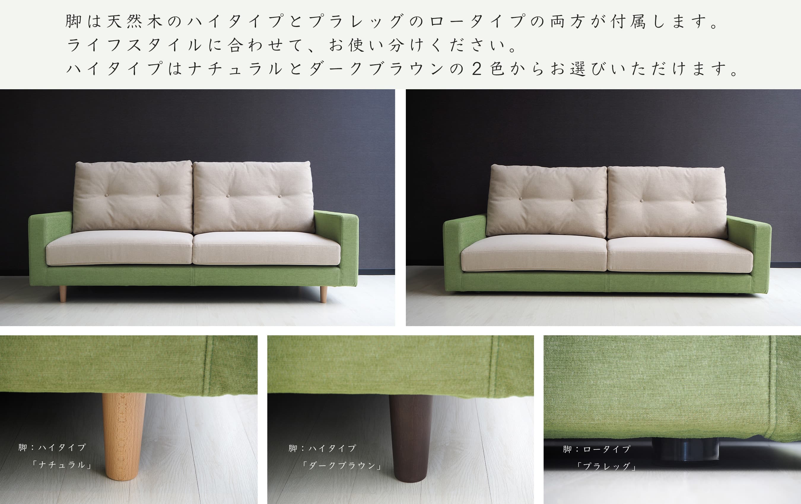 最後に木脚のカラーをお選び下さい。a noi のソファは最初からロータイプとハイタイプの2種類が付属しています。ここでは木脚のハイタイプのカラーがお選びいただけます。